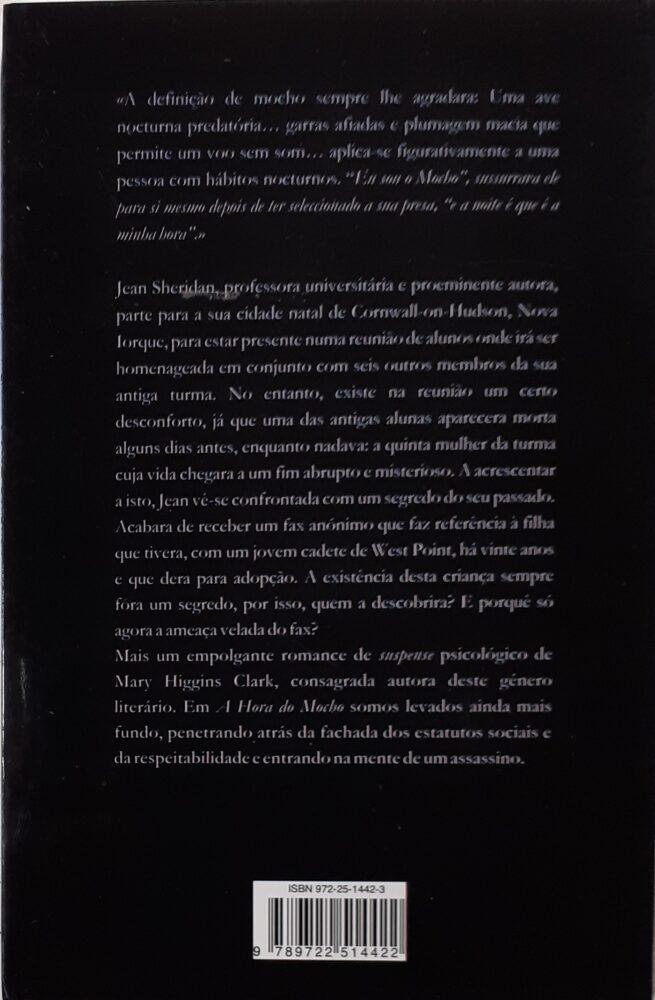 Mais um empolgante romance de suspense psicológico de Mary Higgins Clark, consagrada autora deste género literário. Em “A Hora do Mocho”, o leitor é conduzido, para além da fachada dos estatutos sociais e da respeitabilidade, aos recessos mais profundos da mente de um assassino.