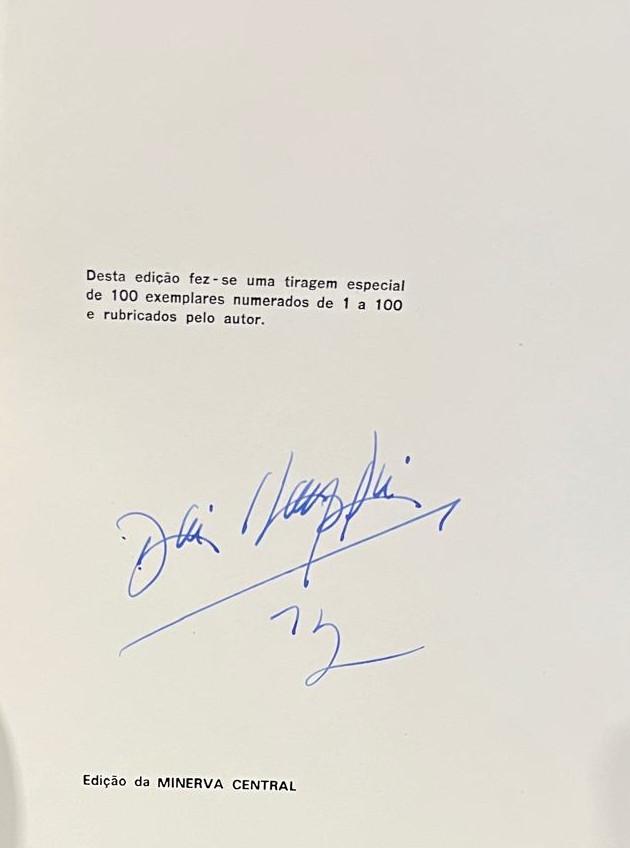 Exemplar da tiragem especial de 100 exemplares numerados de 1 a 100 e rubricados pelo autor.