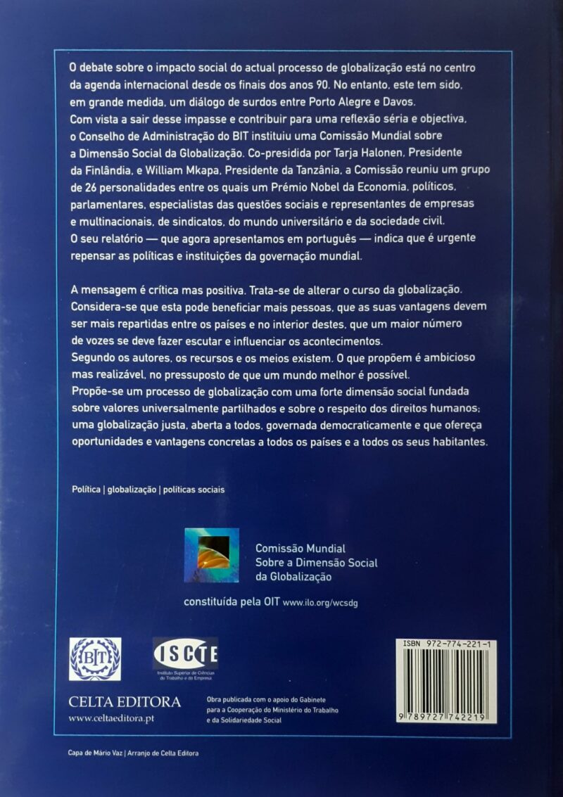 O debate sobre o impacto social do actual processo de globalização está no centro da agenda internacional desde os finais dos anos 90. No entanto, este tem sido, em grande medida, um diálogo de surdos entre Porto Alegre e Davos. Com vista a sair desse impasse e contribuir para uma reflexão séria e objectiva, o Conselho de Administração do BIT instituiu uma Comissão Mundial sobre a Dimensão Social da Globalização. Co-presidida por Tarja Halonen, Presidente da Finlândia. e William Mkapa, Presidente da Tanzânia. a Comissão reuniu um grupo de 26 personalidades entre os quais um Prémio Nobel da Economia. políticos. parlamentares, especialistas das questões sociais e representantes de empresas e multinacionais, de sindicatos, do mundo universitário e da sociedade civil. O seu relatório — que agora apresentamos em português — indica que é urgente repensar as políticas e instituições da governação mundial.